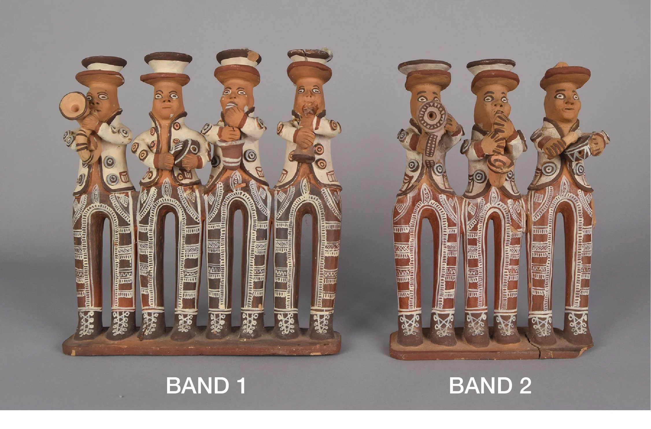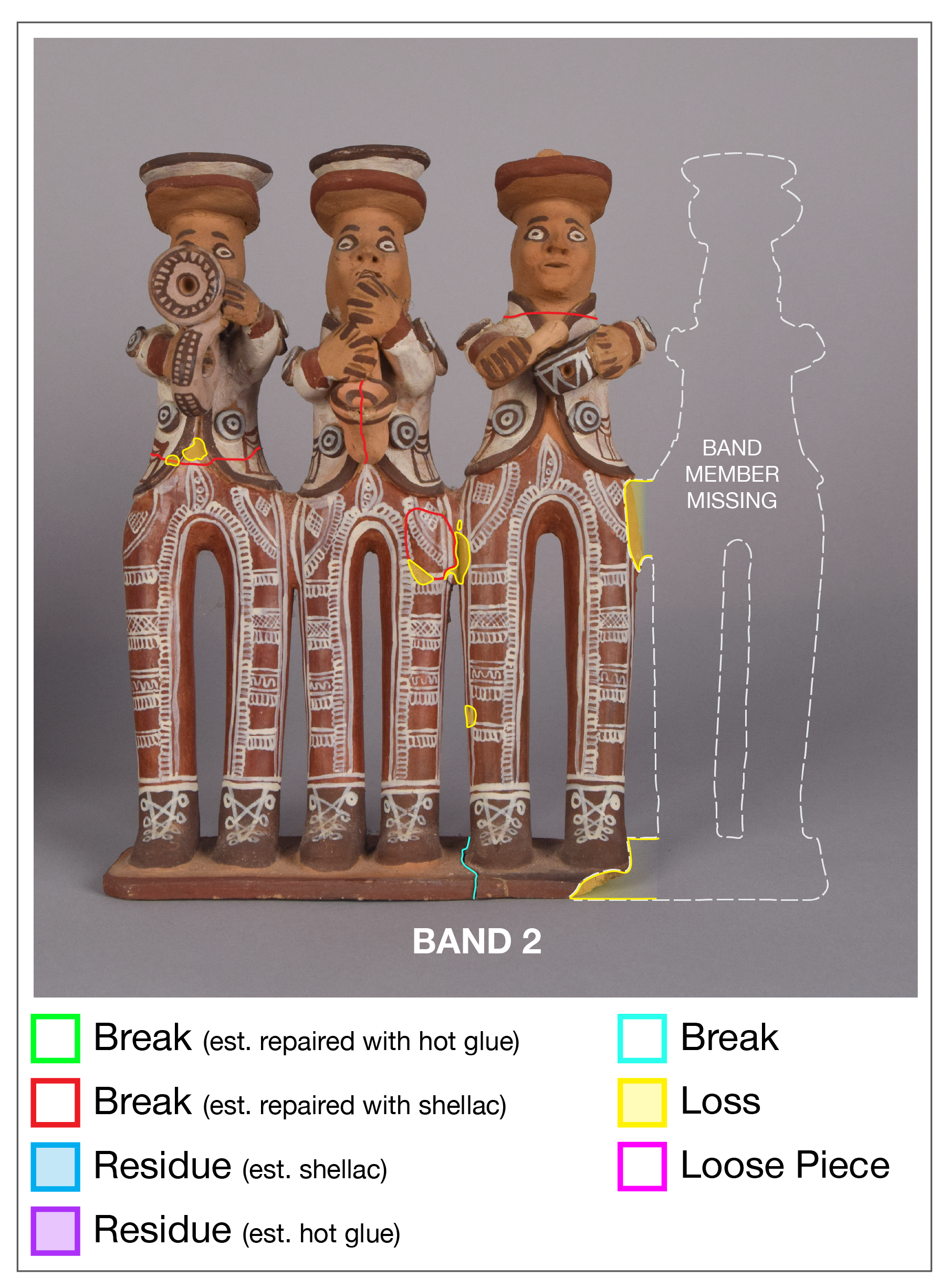 Considering the asymmetry caused by the missing band member when viewing the two objects together, I decided that recreating the missing figure would be a justified step in my treatment. Fortunately, the missing band member on Band 2 was intact on Band 1 and could be used as a reference for the eventual replacement.