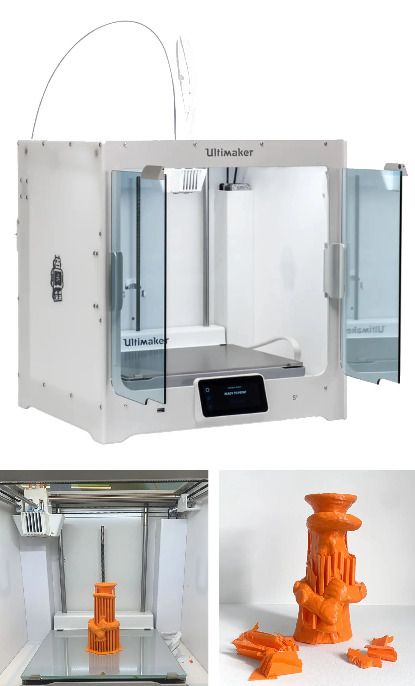Top: Ultimaker S3 3D Printer (image: www.printyourmind3d.ca/products/ultimaker-s5-3d-printer); Below, left: The top half of the new figure after printing and still on the print table, with the typical “scaffolding” created by the 3D printer still in place. Below, right: The “scaffolding” being removed to expose the surface of the top half of the intermediary figure.