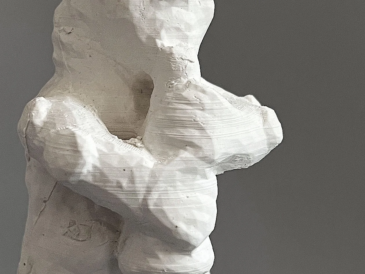 The stratigraphic layers of the 3D print must be thoughtfully sanded away to achieve a smooth and uniform surface while retaining the handmade nature of the original.
