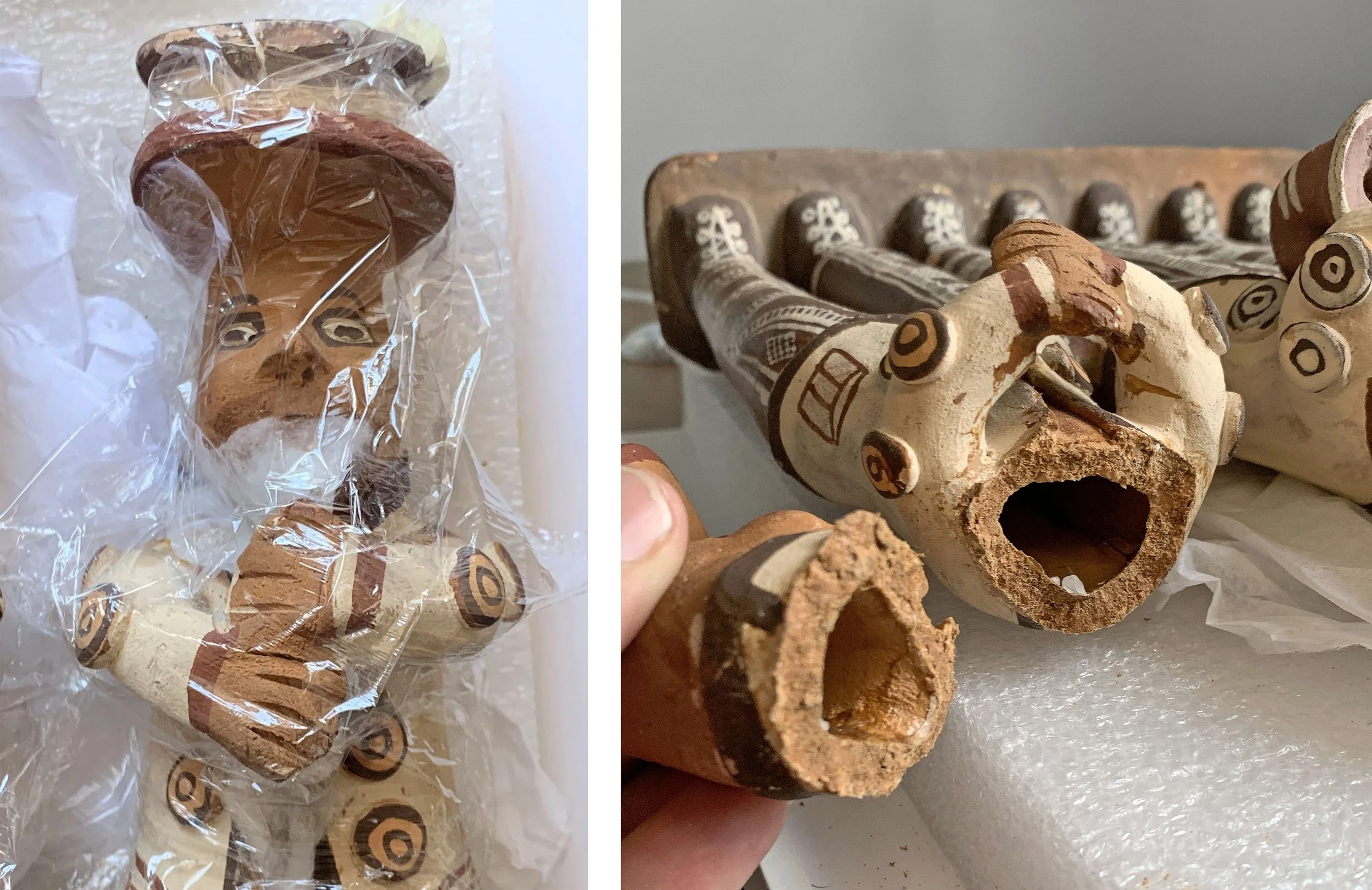 This ongoing treatment concerns two objects: a pair of Peruvian (Quinoan) candelabra made of low-fire ceramic with painted decoration.