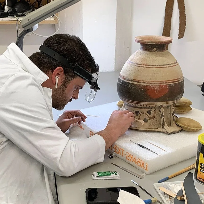 Reassembling a ca. 7th-century BCE Corinthian pyxis: Selinunte Archaeological Park, Italy, 2023.