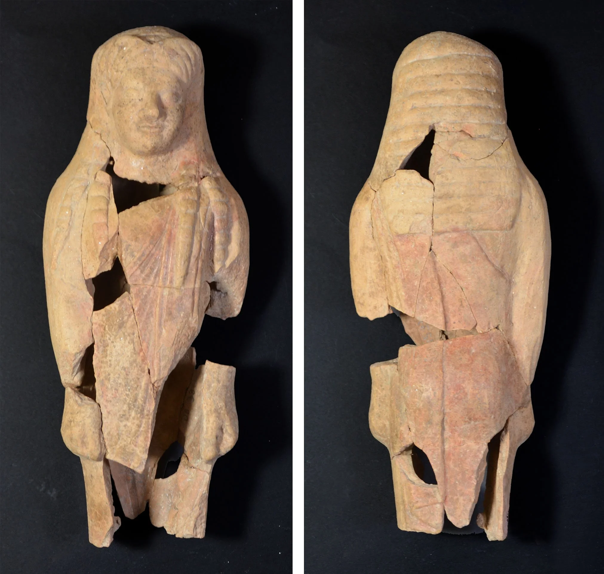 This small ceramic statue of a kouros, considered the most important find of the 2023 season, was found in fragmentary condition in several stratigraphic layers near an early temple in Selinunte’s main urban sanctuary. The polychromed surfaces needed consolidation before I joined the fragments using progressively stronger weight to volume concentrations of synthetic adhesive resin. I created a drawing, shown below, for the archaeologists referencing the stratigraphic layers where the various fragments were found.
