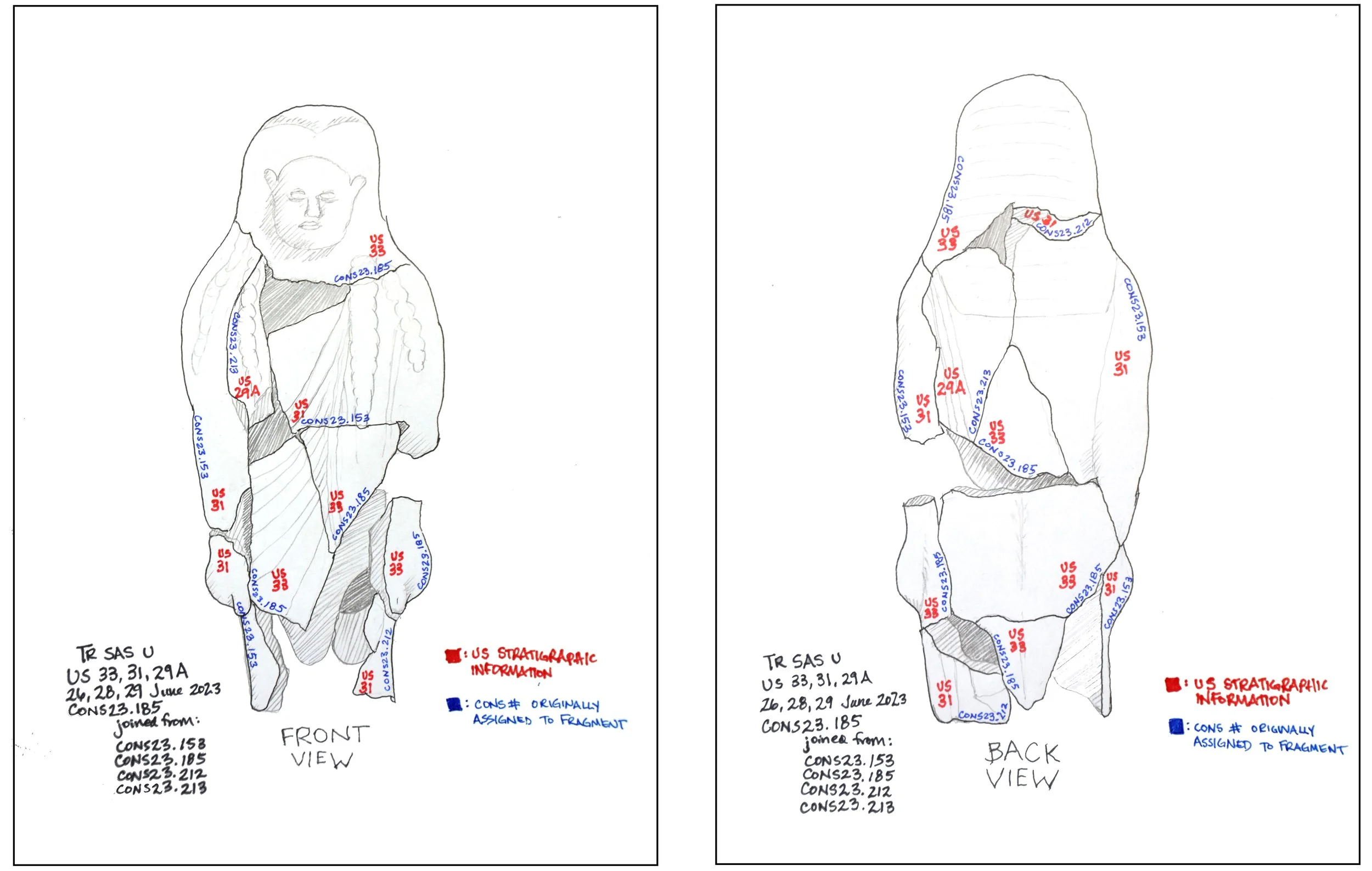 Above: Drawings of the recto and verso of the kouros, including stratigraphic information. Click to enlarge.