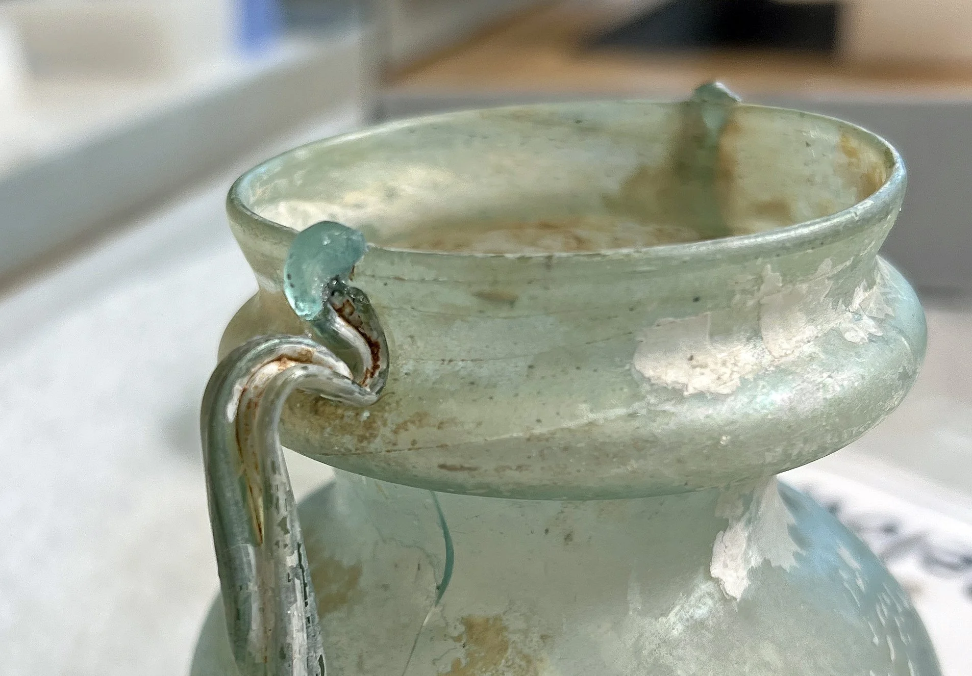This ancient glass vessel is in the collection of a museum in Lebanon, Syria. A large blast resulting from a terror attack had broken the vessel into 5 fragments and created several blind cracks which compromised the structural integrity of the object.