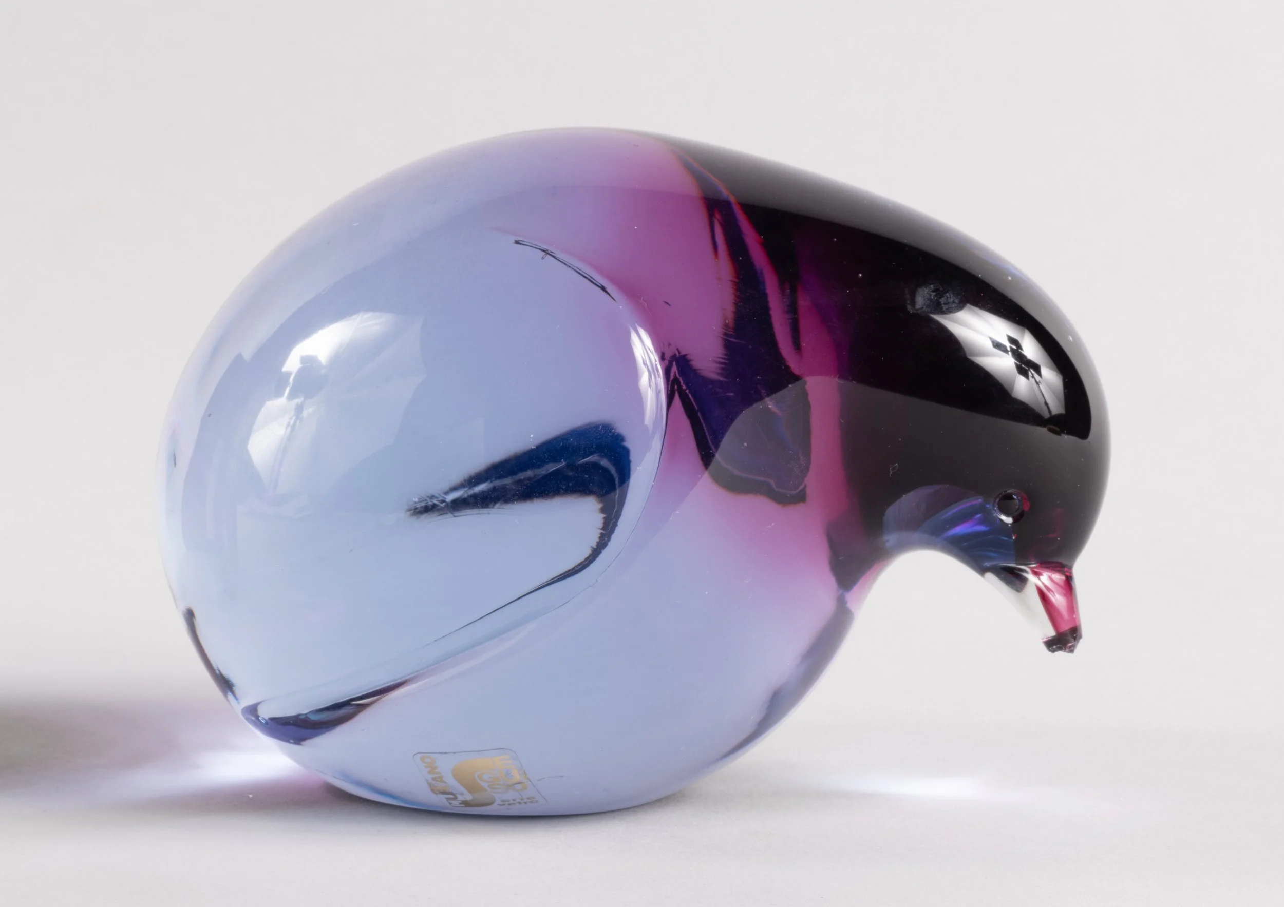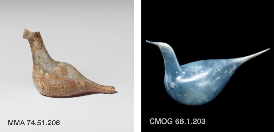 The art of making bird figurines from molten glass goes back millennia. The earliest examples appear as Egyptian pendants, but as once the art of glassblowing became more widespread, the shape was adapted to be used for vessels for holding a variety of liquids (i.e., perfume). The Metropolitan Museum of Art’s Glass bottle shaped like a bird (Roman, ca. 1st century AD; MMA 74.51.206) is described as having a “drawn out at back to form stylized tail,” the same technique likely used in the creation of the beak of the Murano bird.