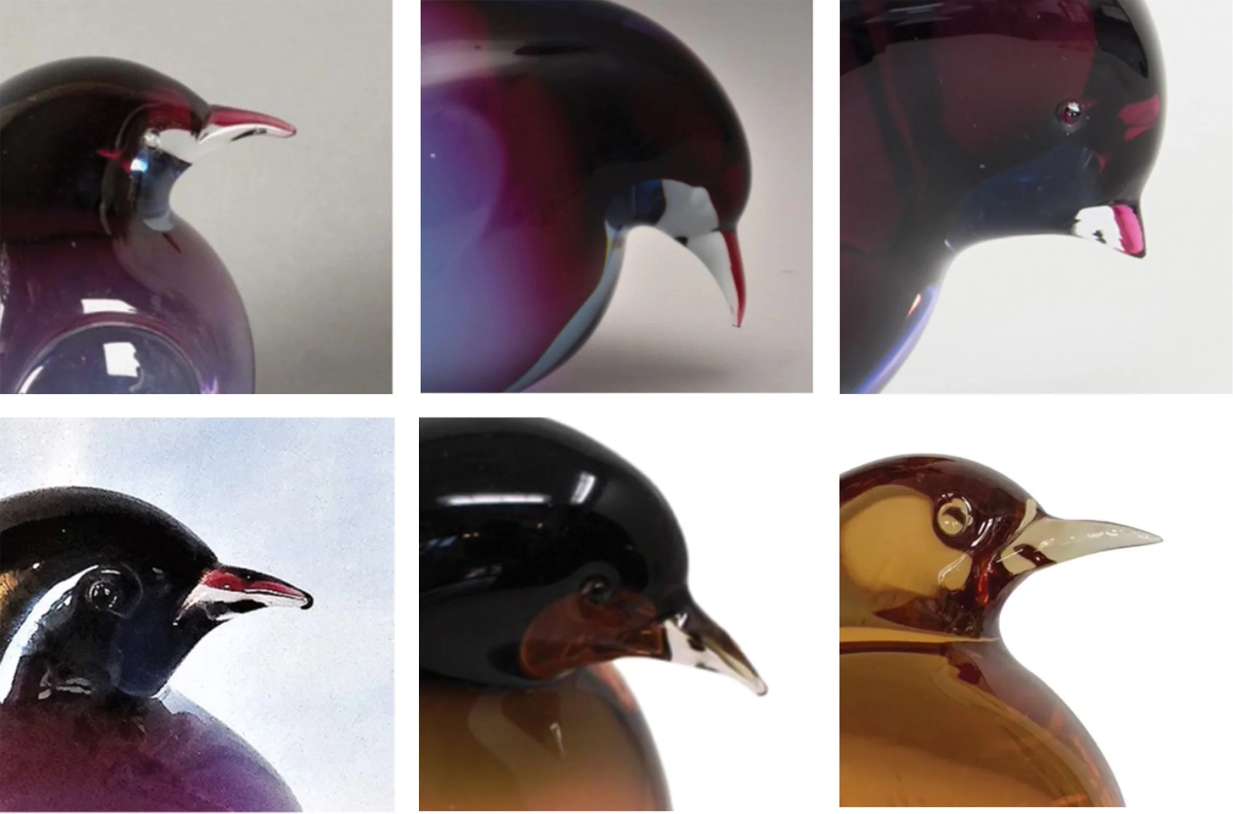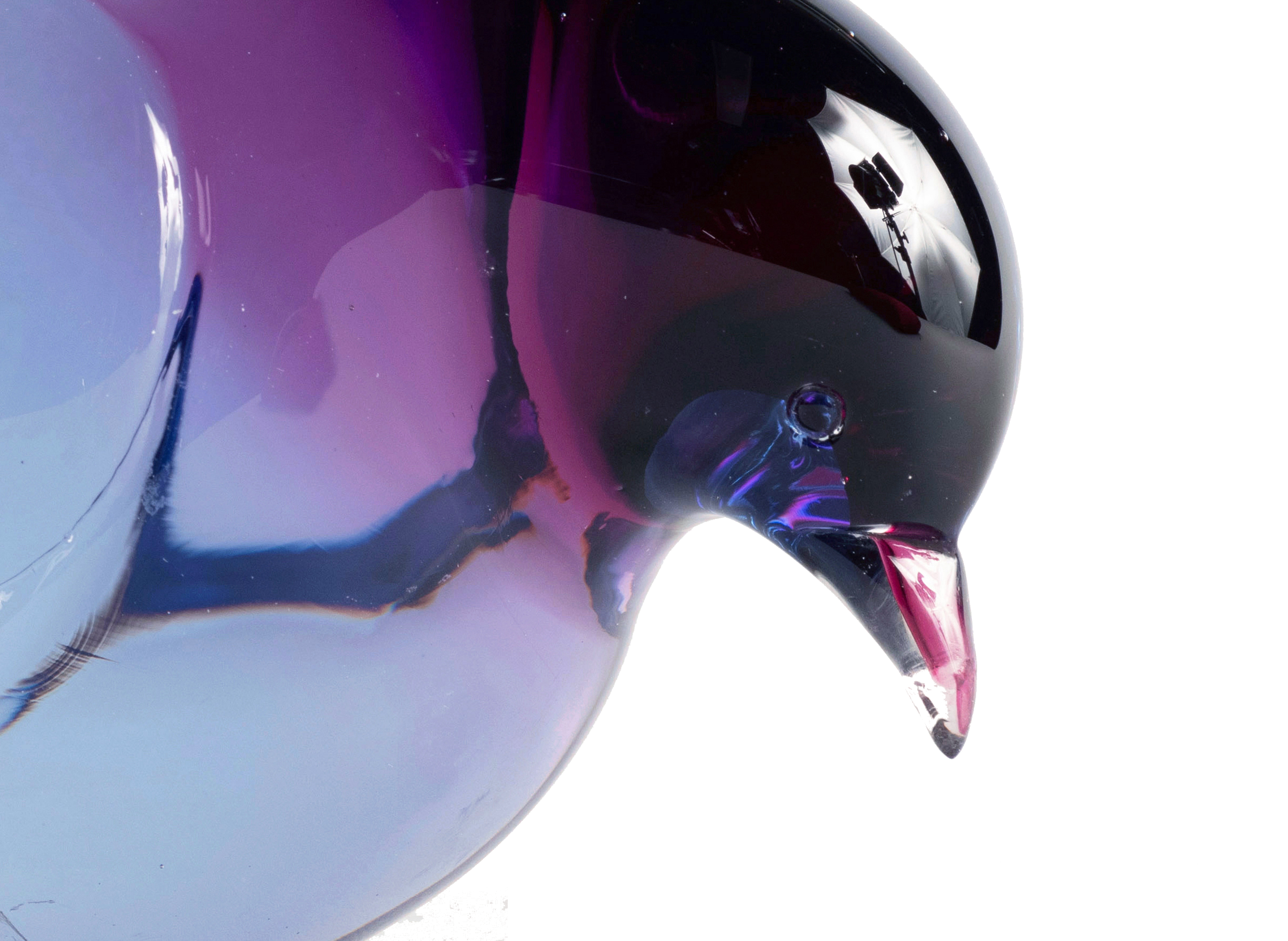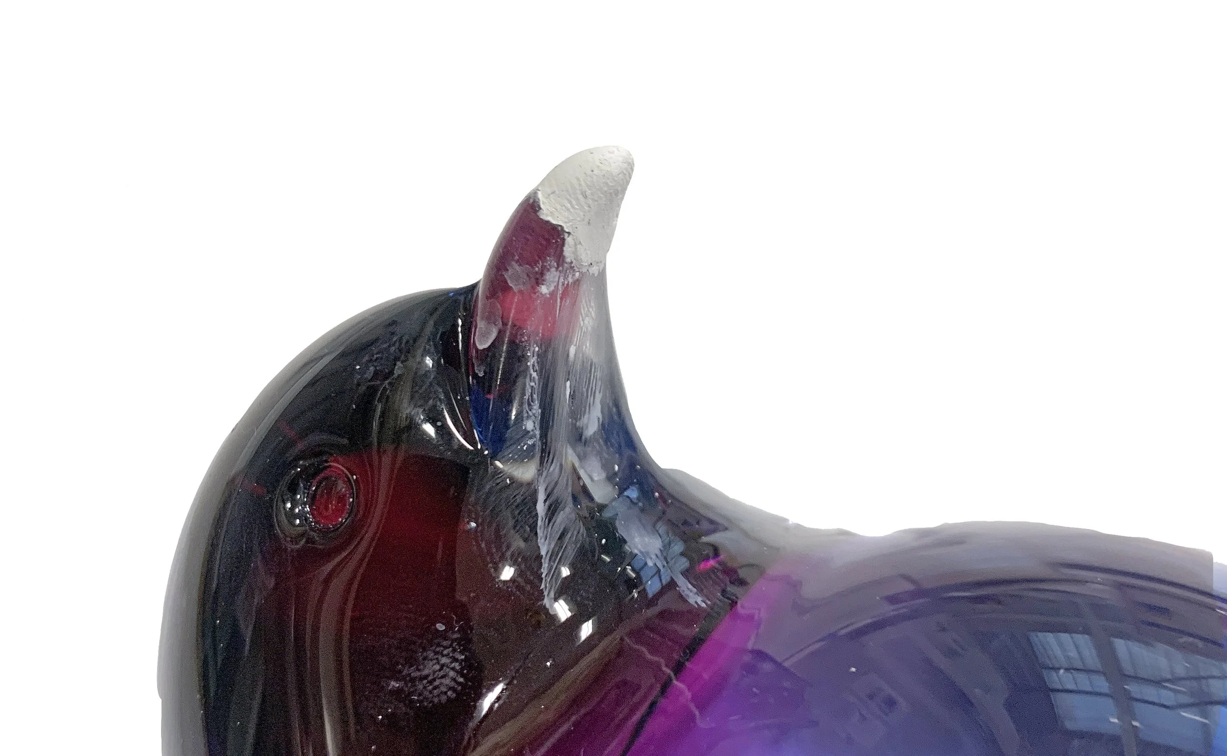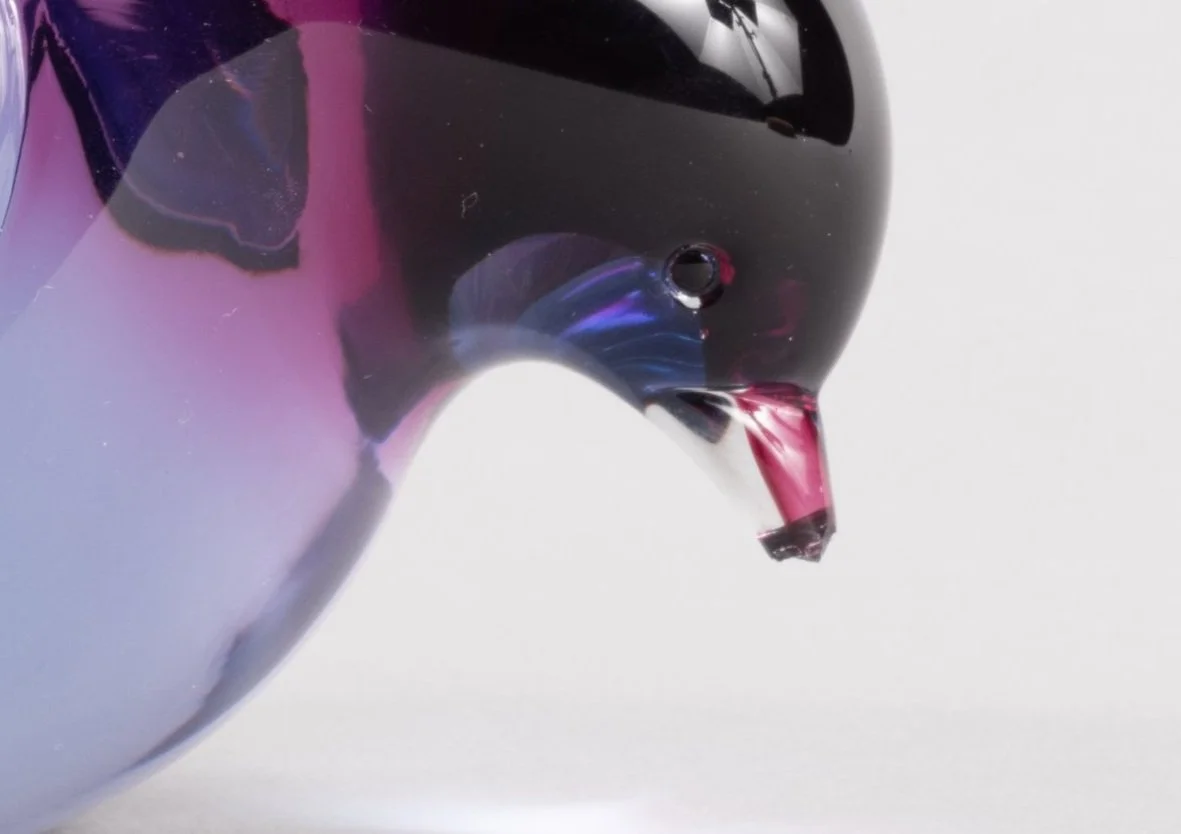 The loss to the tip of the bird’s beak resulted in a series of concentric fractures and jagged edges which made the reintegration of a replacement beak a complex endeavor. Complicating the matter is the fact that the beak was created with a streak of violet colored glass running its length. Recreating the tip of the beak required a gapless join and extending the colored glass into the replacement.