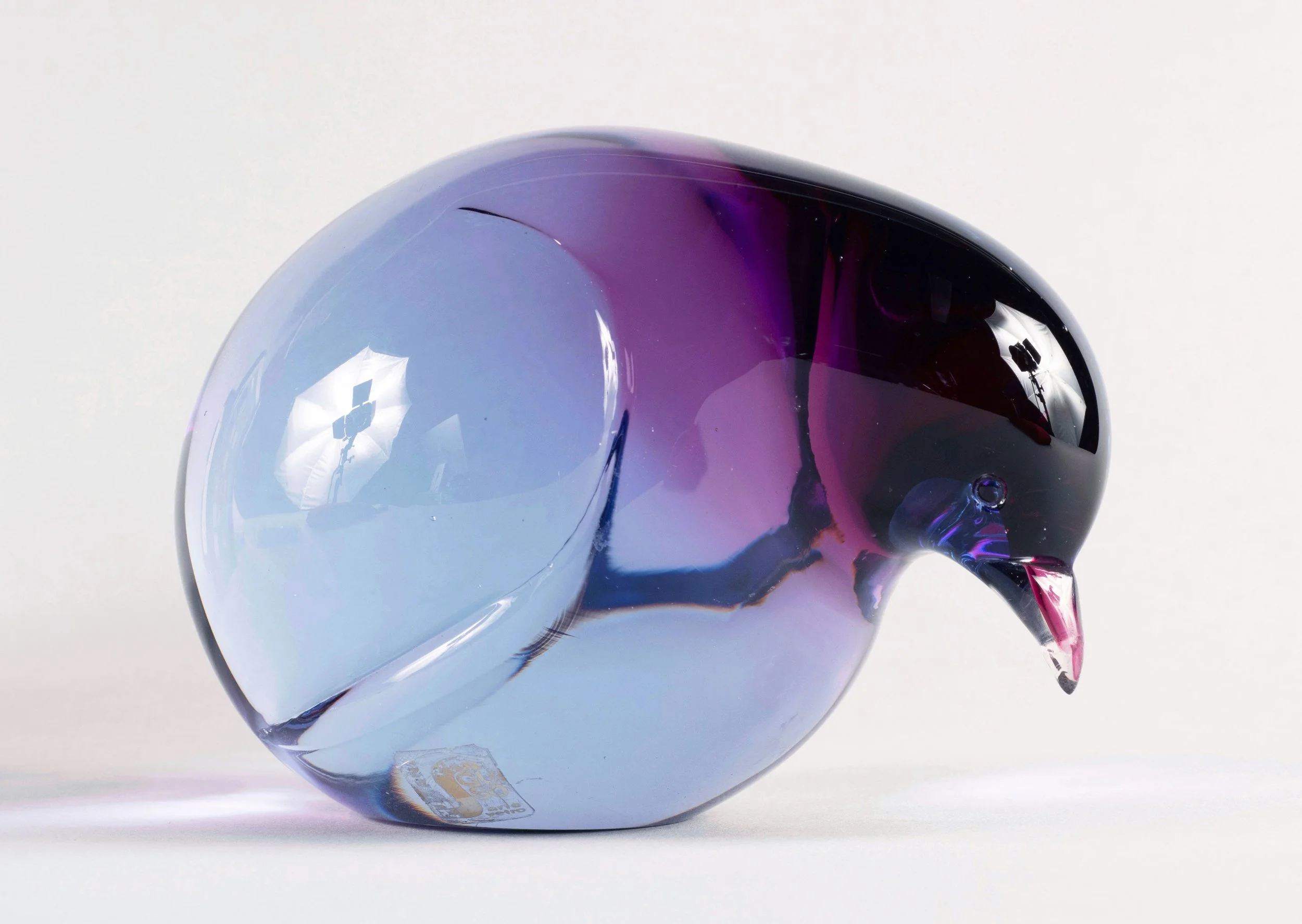 The glass bird arrived to the conservation studio with a noticeable loss to the tip its beak. While in stable condition, this loss was visually disturbing and interrupted the object’s clean, modern profile and the even dispersion of the violet colored glass.
