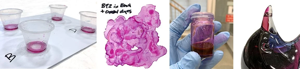Above, L to R: B72 adhesive resin cast into cups after being dyed using Orasol dyes; B72 solubilized in ethanol and dyed with Orasol dyes, the jar of dyed B72, a test streak of colored B72 applied to the replacement beak.