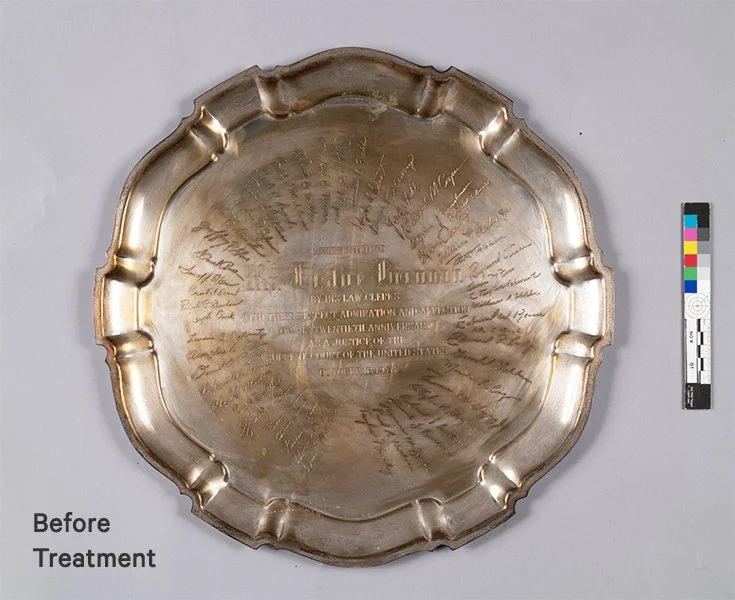 Below: A significant loss toward the center of the dish was filled using conservation-grade materials and inpainted to match the surrounding surfaces.