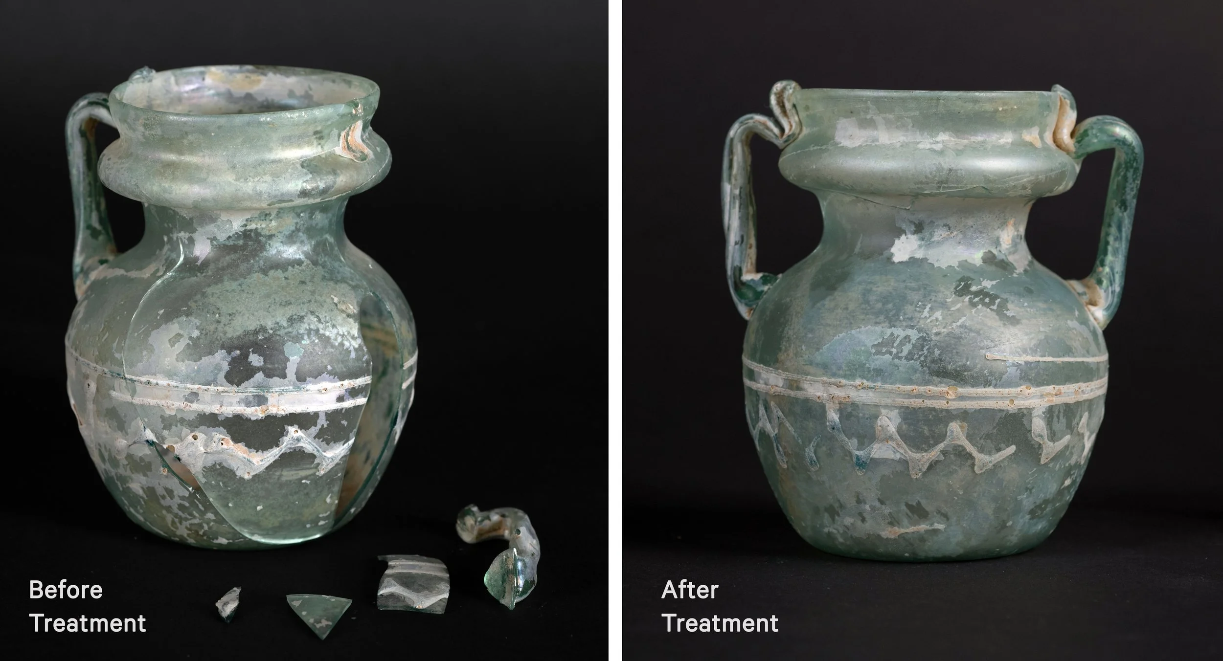Above: Before and after treatment images of a small glass jar with handles and trailed decoration.