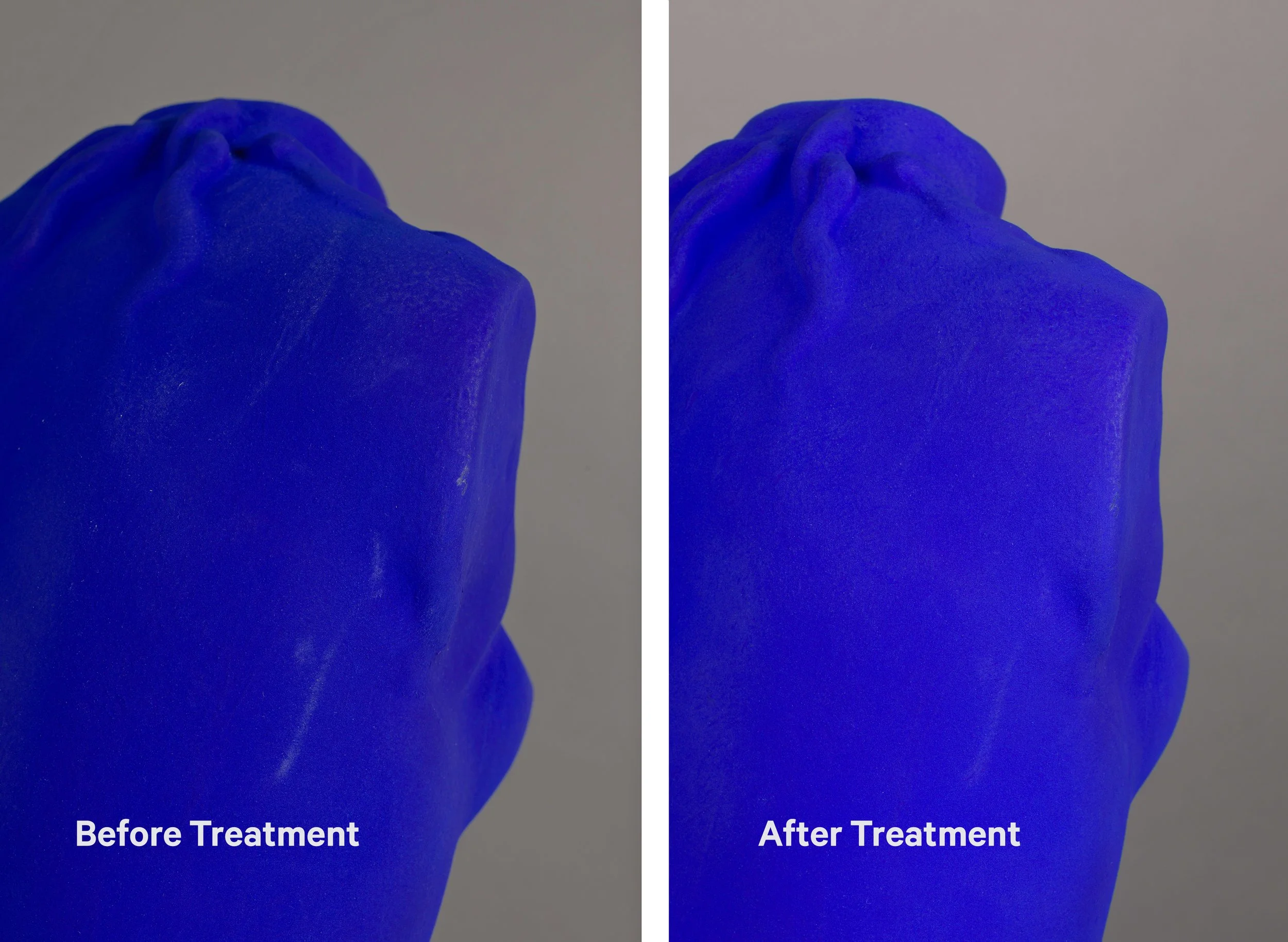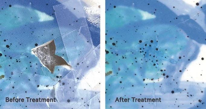 Above: Visually disturbing scuffs, scratches, and compressions were successfully reduced via the careful application of compatible solvents.