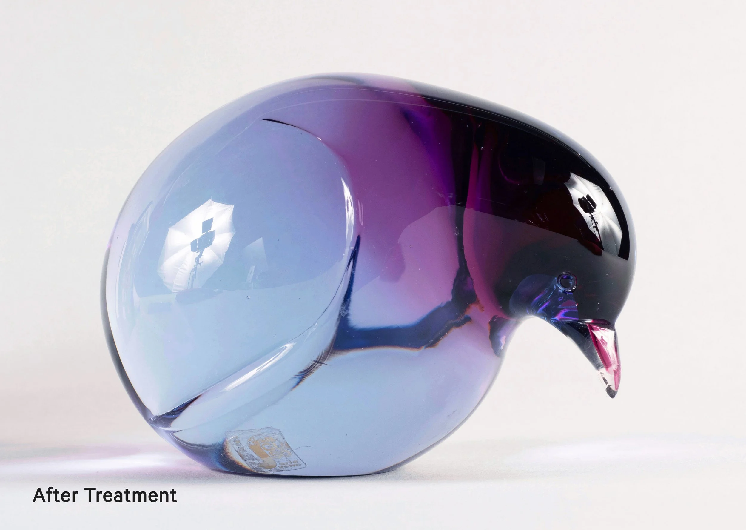 A glass bird made in Murano, Italy arrived at the studio with a broken and lost beak. A replacement was molded and cast using a conservation-grade epoxy resin.