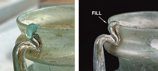 Below: A loss to the rim and handle of the vessel was filled using tinted conservation-grade epoxy and inpainted using a variety of materials to match the surrounding weathered surfaces.