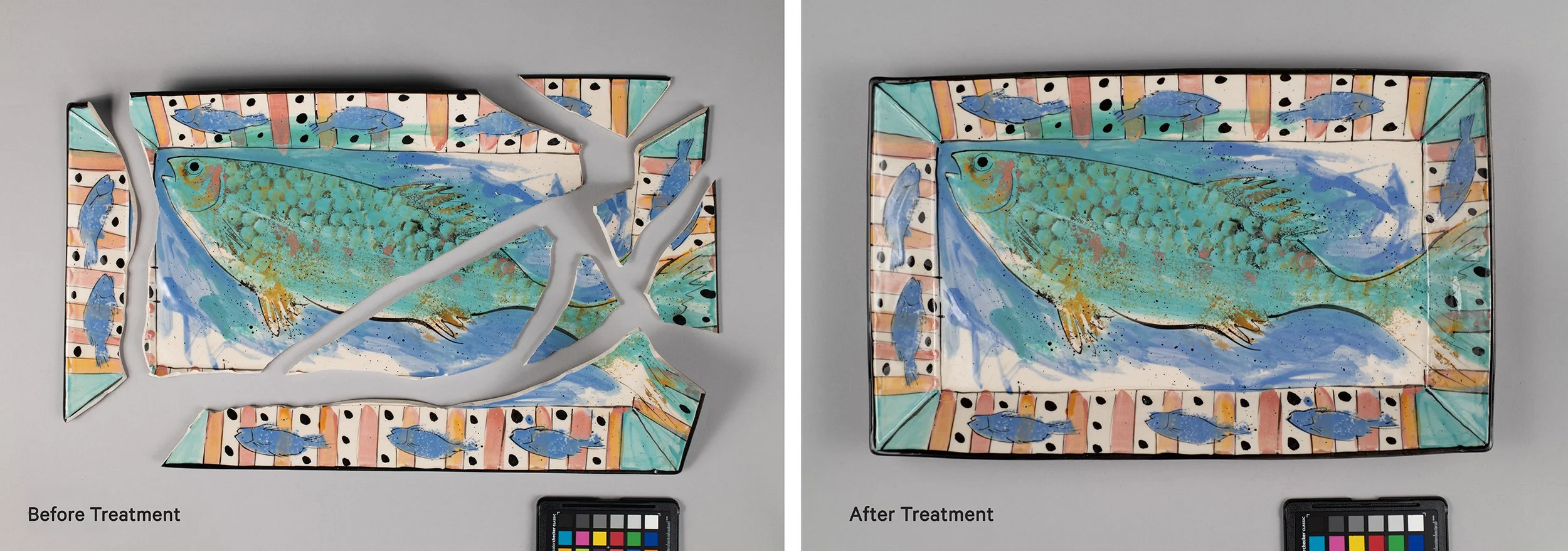 Above: Before and After Treatment images of a low-fire ceramic platter. The platter had separated into 8 large fragments and many small ones.