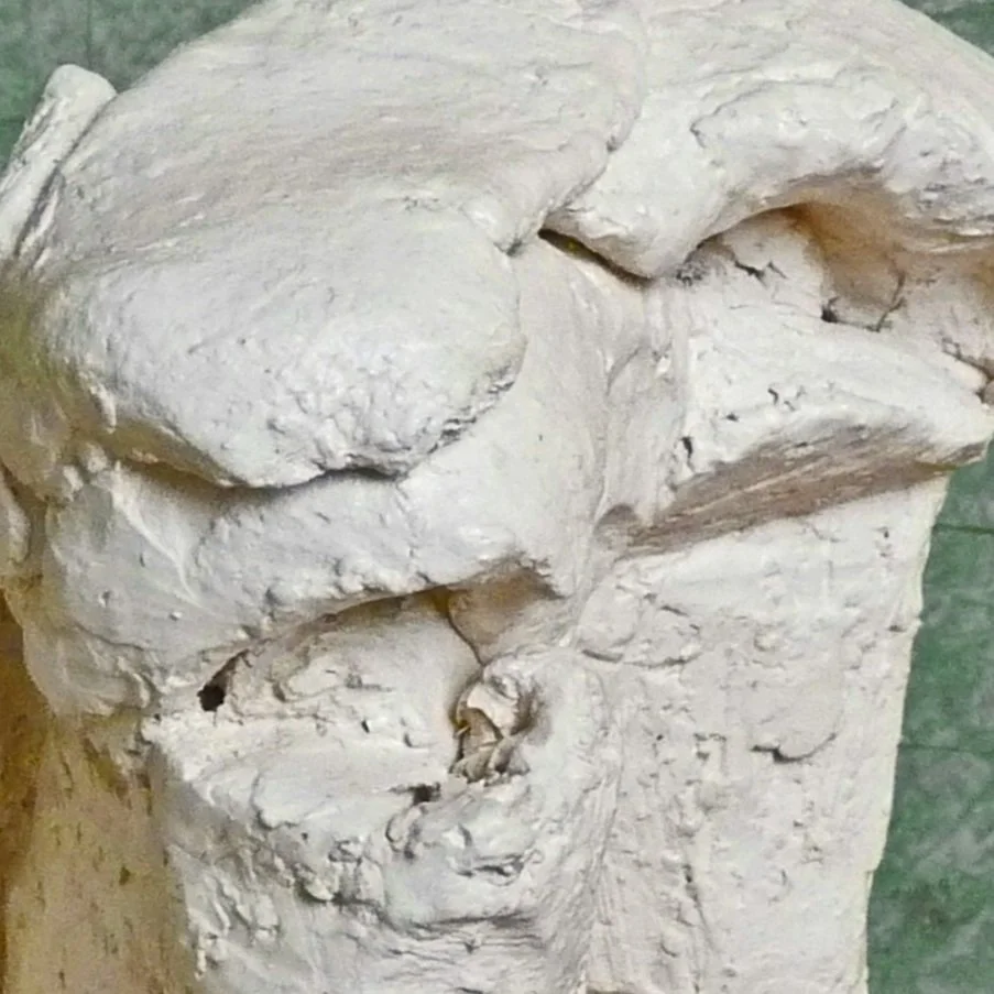 Close-up of a white clay sculpture of a woman's face, with detailed features and closed eyes.