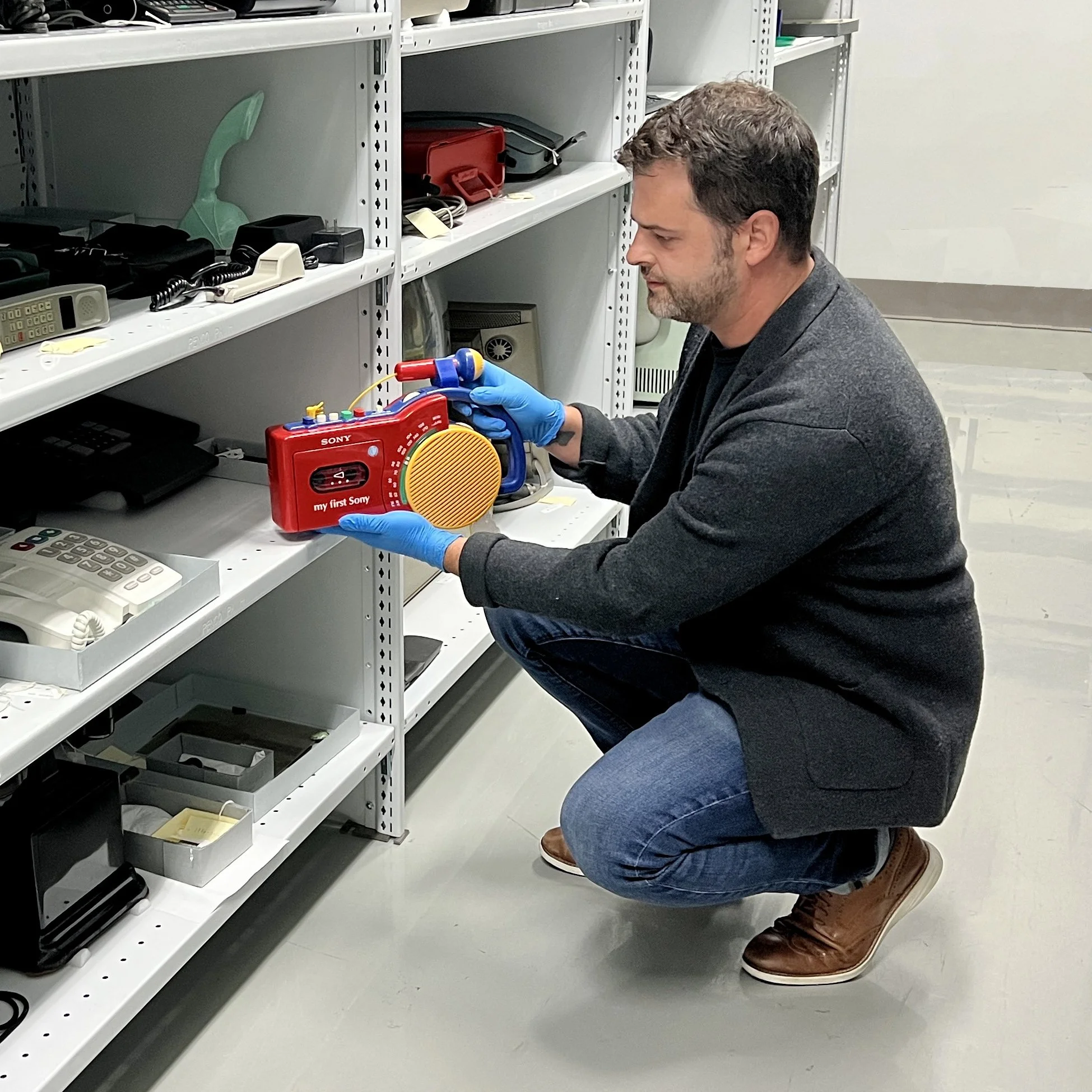 A man wearing a dark blazer, blue jeans, brown shoes, and blue gloves is kneeling and examining a vintage red toy camera on a white shelf filled with electronic devices.