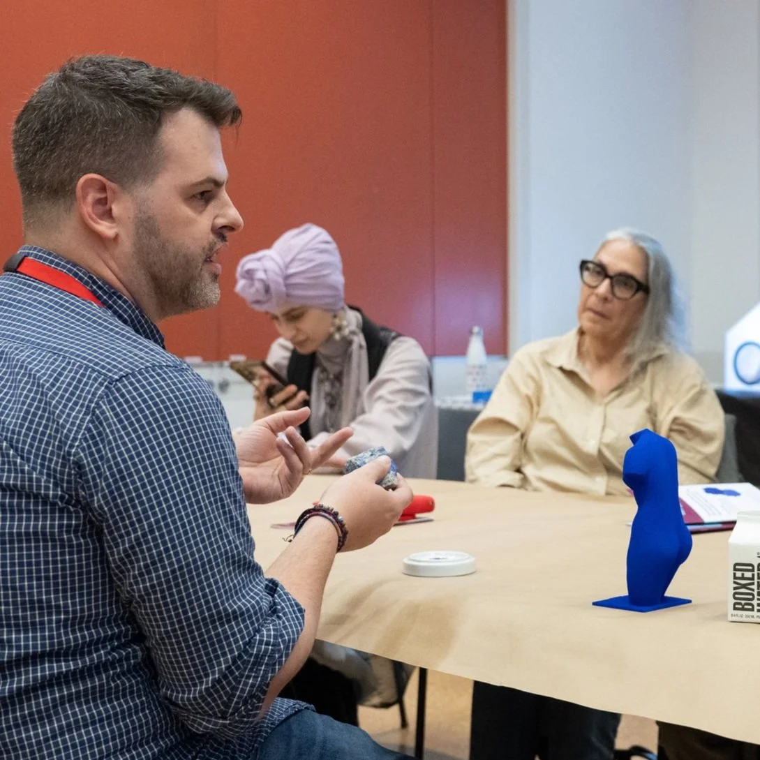 Three people sitting at a table, engaging in conversation. The man in the foreground is talking and holding a small object, while two women are listening; one behind him using a phone, the other with glasses and gray hair looking on. On the table, there is a blue cat-shaped sculpture and some objects.