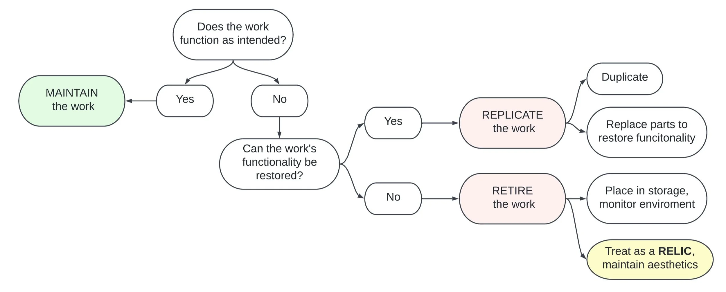 When a work of kinetic art no longer moves, and it cannot be restored to its original functional condition, you are faced with two principal options: you may either choose to replicate the piece or retire it altogether. In opting to retire the artwork, one may decide to preserve it as a relic, honoring its historical and artistic significance despite the loss of its mechanical movement. This was the option chosen for this object.