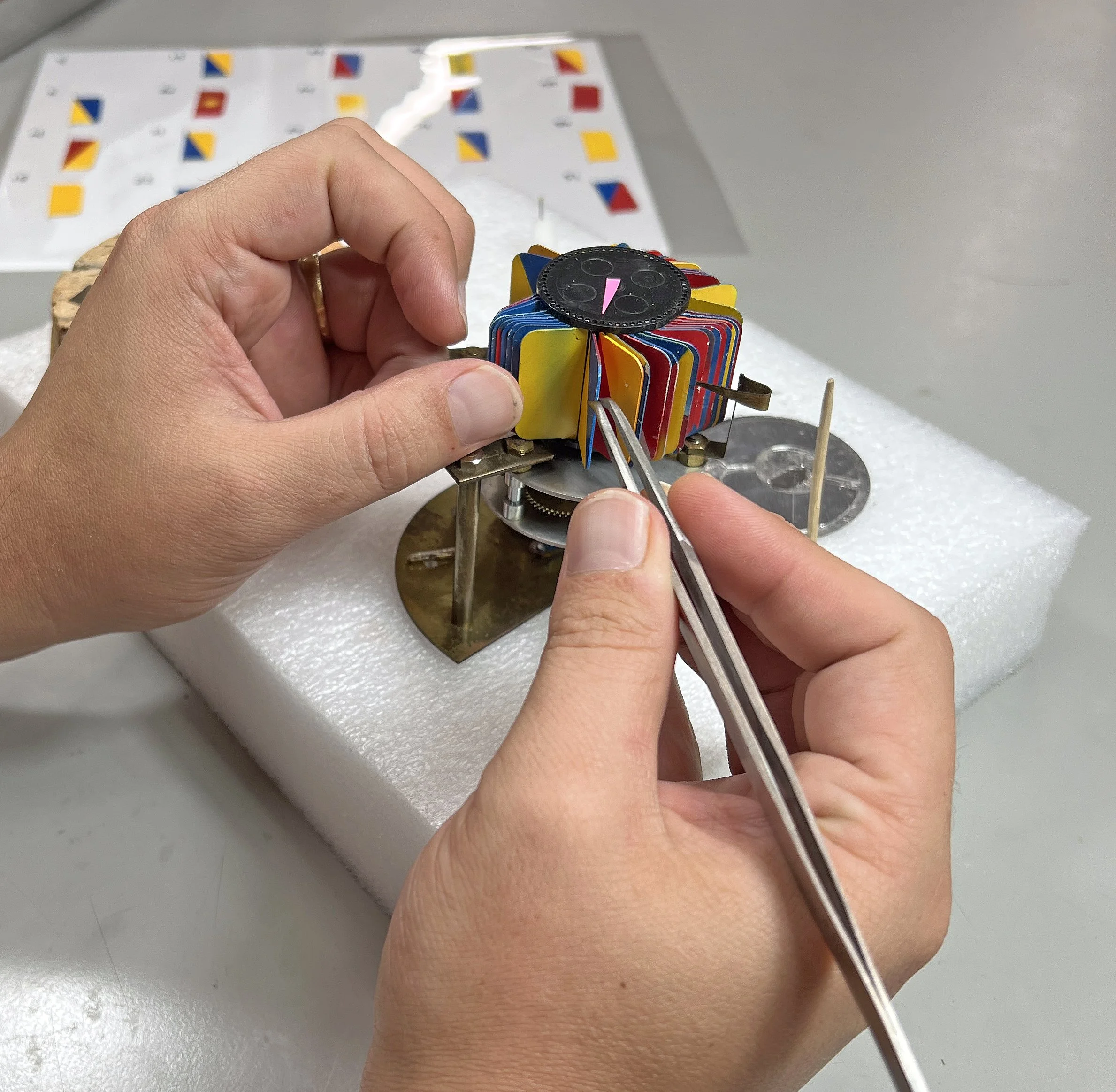 Finally, I inserted the replacement fans were carefully inserted into the original drum using tweezers. The order of the pattern was unknown, so I made a diagram of the paintings on the intact drums and, finding no discernible pattern, inserted the replacement drums using my best judgement.