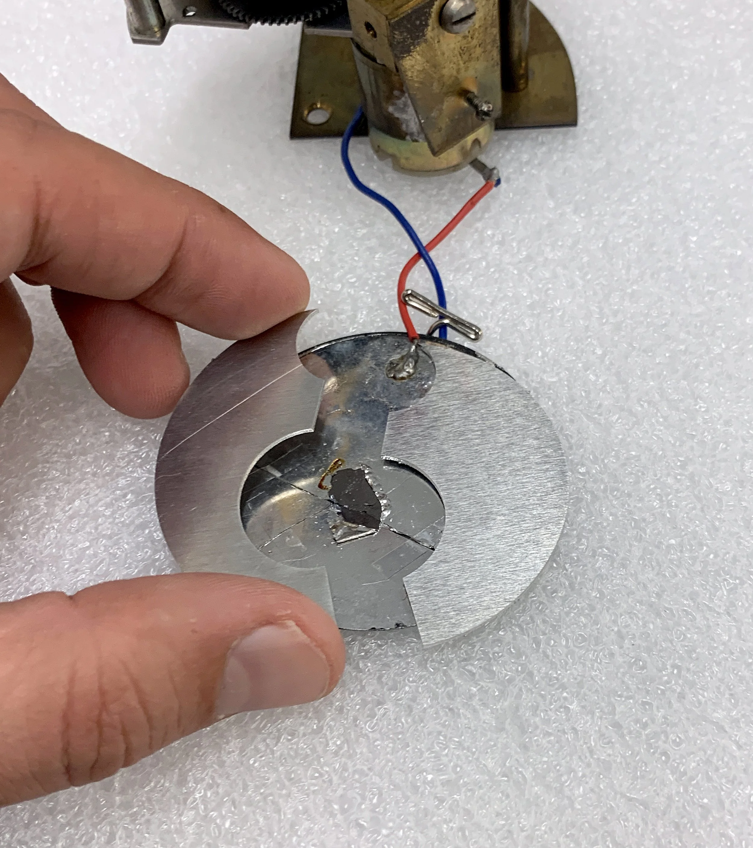 Looking at the archival image, It was immediately clear that the glass dome which once fit over the assemblage was missing. In addition, the top motor unit has detached from the cork base and the solar cell had fractured.