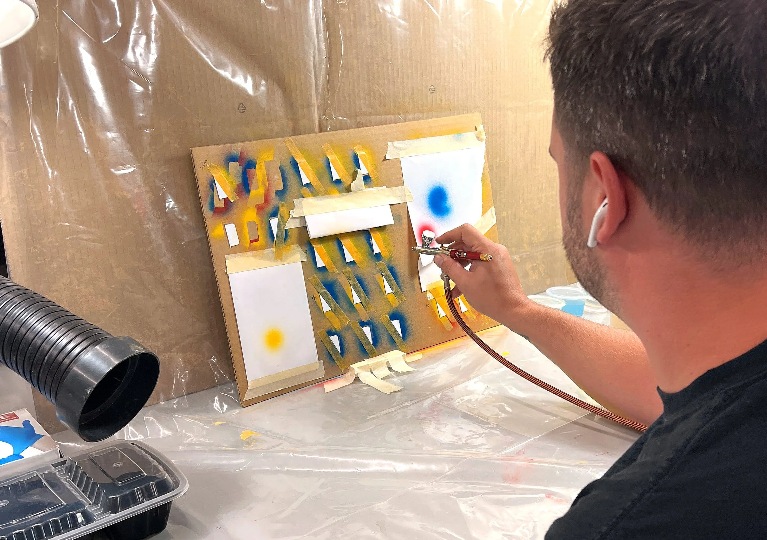 The replacement fans are virtually indistinguishable from the originals, exhibiting the same crisp lines where colors delineate but playful application with uneven areas and exposed edges.