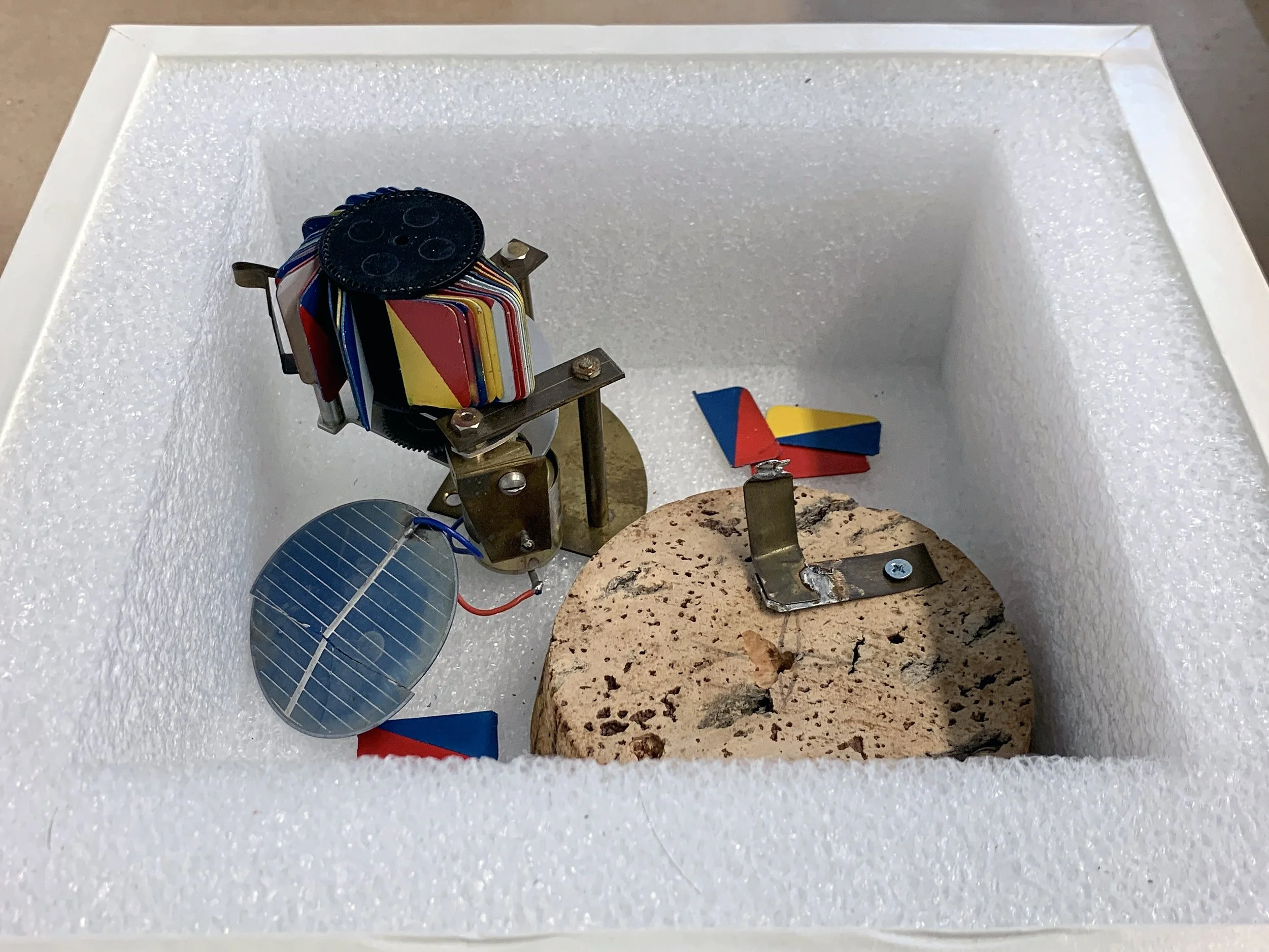 When presented with a box of broken parts, the only indication that this small artwork ever moved was the presence of an electric motor and attached solar cell.