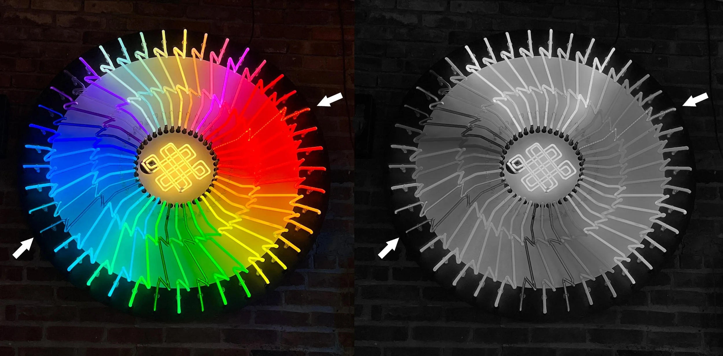 I traveled to upstate New York, where the neon studio who fabricated many of Sonnier’s works is located. I identified the two red and blue colors Sonnier would have used in the late 1960s when this work was made. When an image of the color wheel was converted to grayscale, it became clear that the artist’s studio was correct in their assumption. We felt confident in our decision that the vertical tube was blue and the horizontal tube was red.